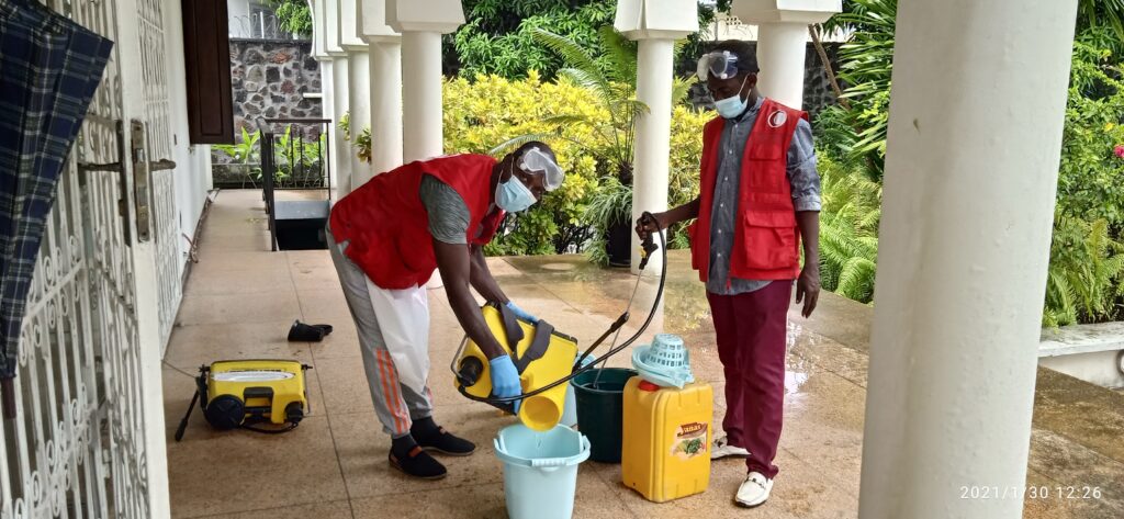 Depuis la déclaration officielle de l’épidémie au mois de Mars 2020 à ce jour 31 janvier 2021, 5 369 litres de Chlores sont produits au sein du CRCo (Croissant Rouge Comorien) dont 2 439 utilisés (1 042 litres livrés au Centre de Prise en Charge Covid-19 de Samba-kouni et 1397 litres de chlores distribués dans le cadre de la prévention contre la propagation du Coronavirus) et 200 litres en stock à la grande-Comores. A Mohéli la production du chlore est 2 730 litres dont 2 720 litres de chlores distribués dans les 2 structures de prise de prise en charge Covid-19 et au niveau communautaire.